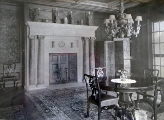 Glass doors on the south wall of the stair hall lead to a small lobby, located in the center of the house on axis with the front door. To the east of it are the dining room and kitchen; to the west a reception room and library. Let's go east to the dining room. Old images label the corridor in the second image as the "tapestry hall, " for reasons we shall shortly see.
