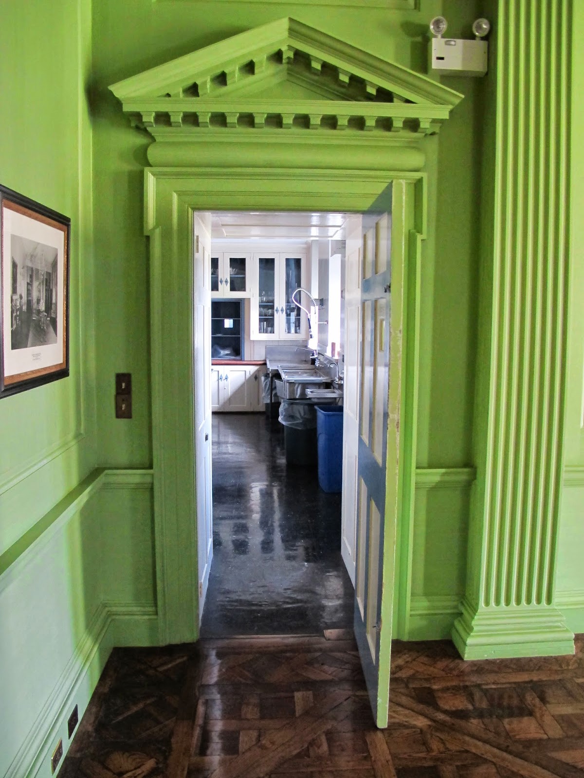 At the easternmost end of the house is this very grand drawing room. Great pains have been taken here to restore paint colors, curtains and valances. To many modern eyes, probably because it's big and has no furniture, the drawing room is assumed to have been a ballroom. Not so. It was intended for entertaining guests, usually before dinner, and would only have very occasionally (if ever) been cleared of furniture for dancing.