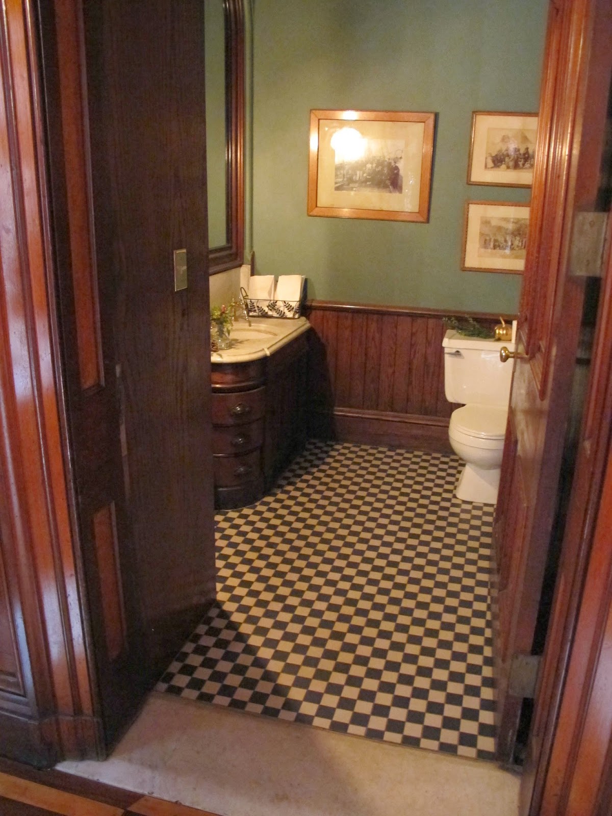 At some point the billiard table was exiled from the billiard room, which then became a music room, although I don't think they ever called it that. Like the rest of the first floor, it has undergone a quite gorgeous restoration. The small powder room located in a closet under the main stair isn't new, but I doubt it was part of the original plan.