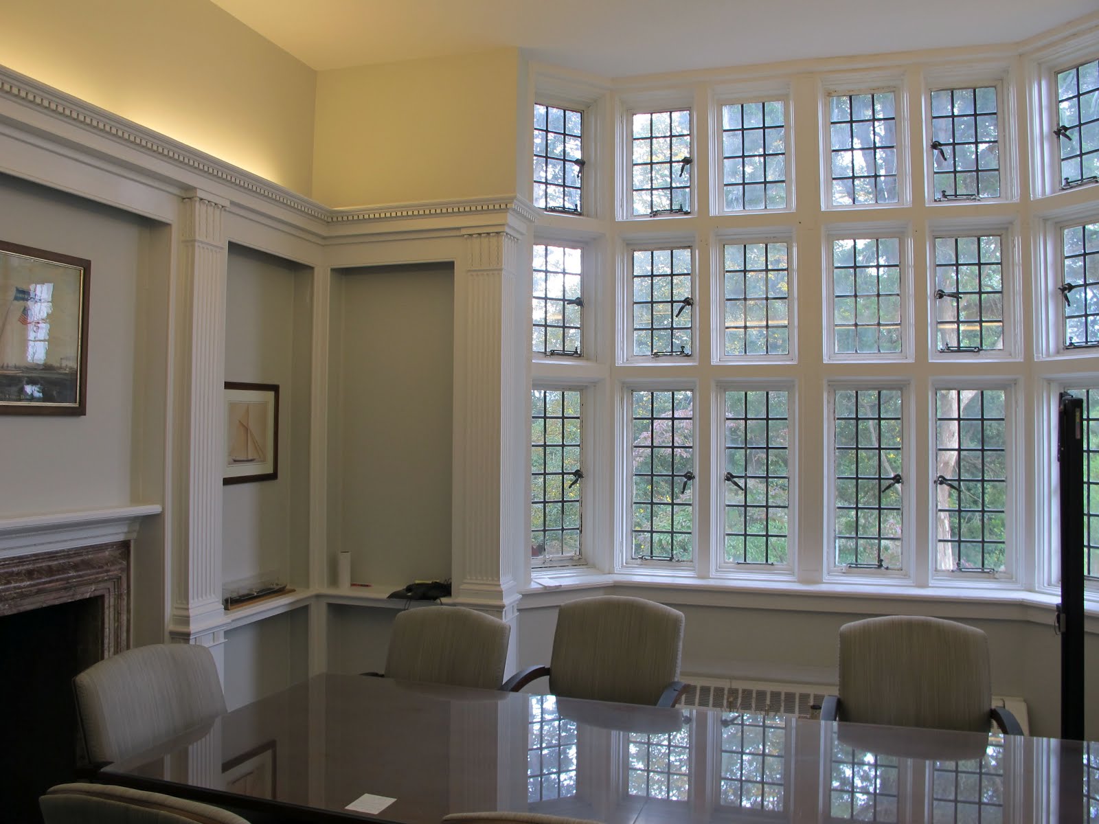 An immense drawing room with fine views of the Sound parallels the entrance hall. I am told that when Webb moved in, the ornate plaster ceiling was in such poor condition it had to be replaced with the present wood coffering. Luckily this happened in 1947 and not today, or we'd be looking up at acoustical tiles.